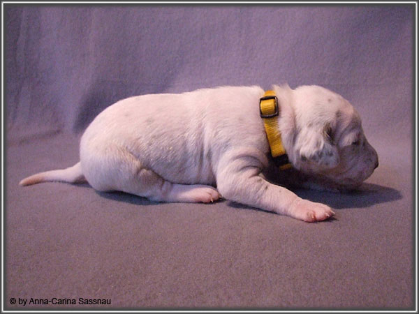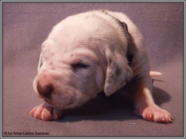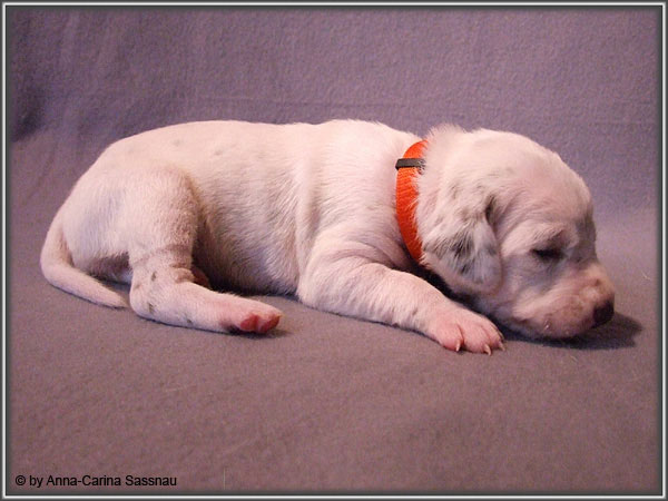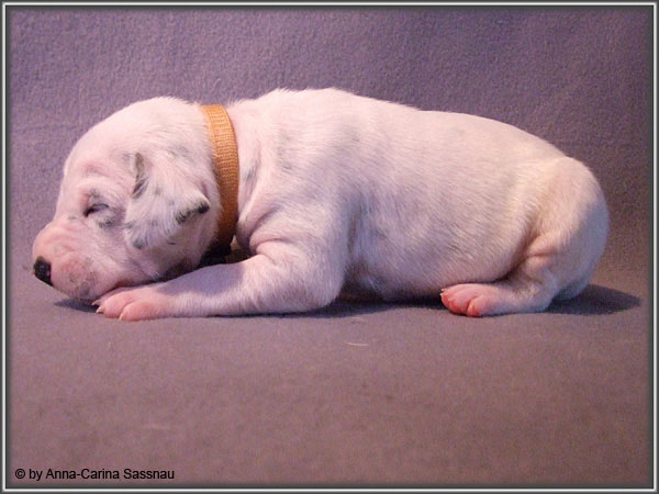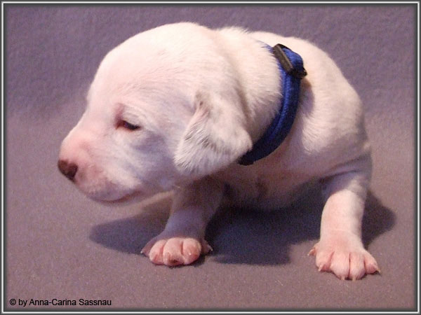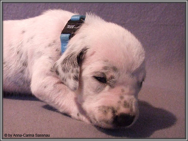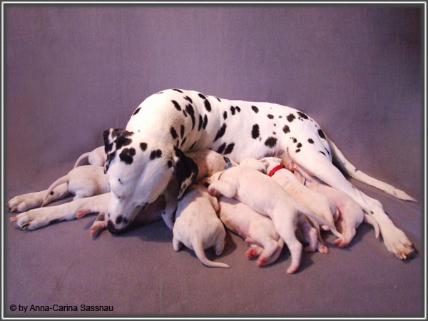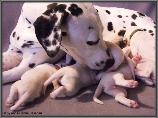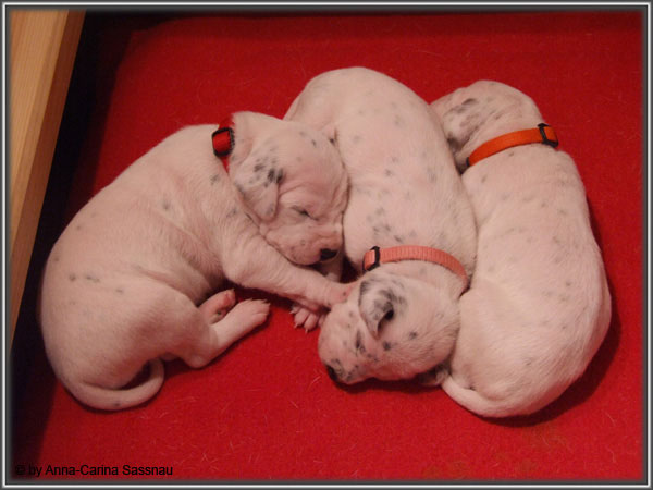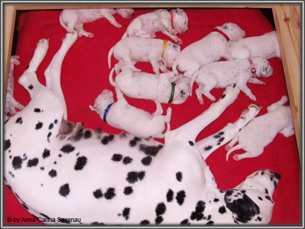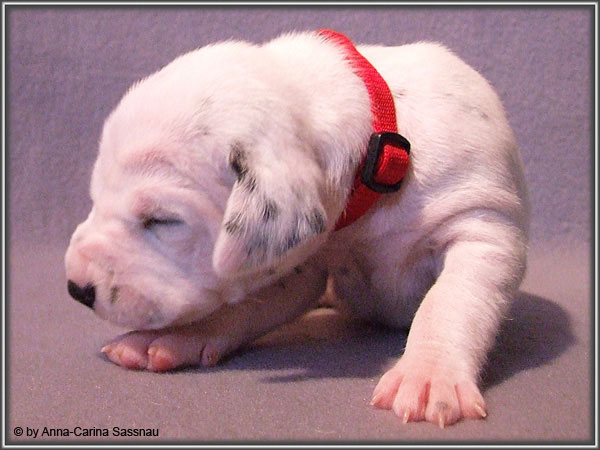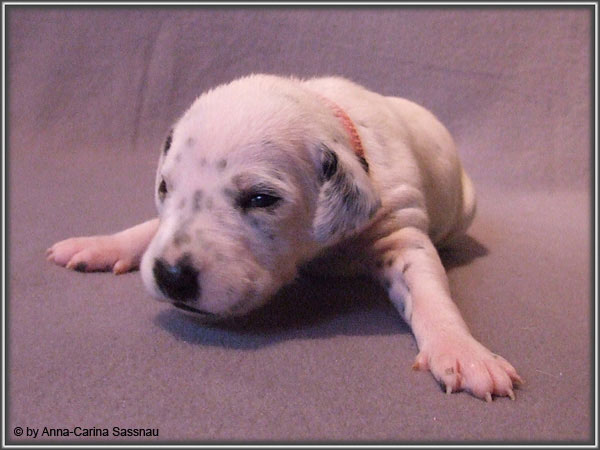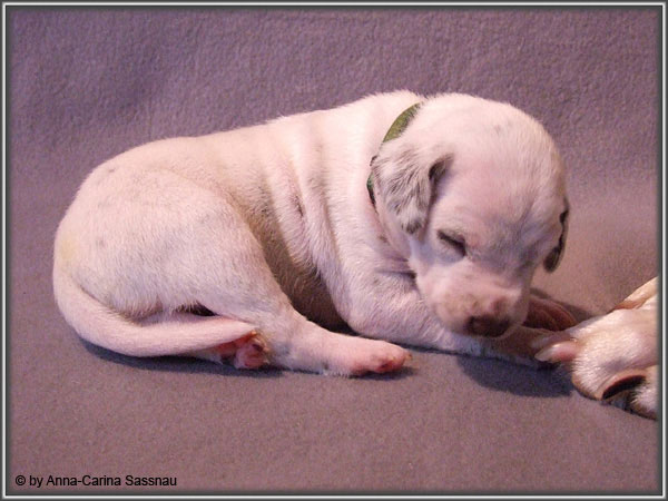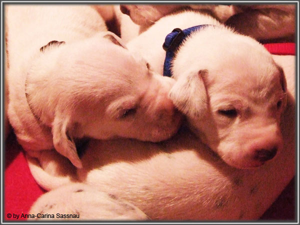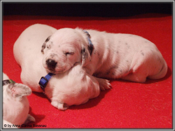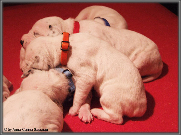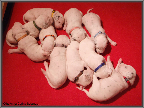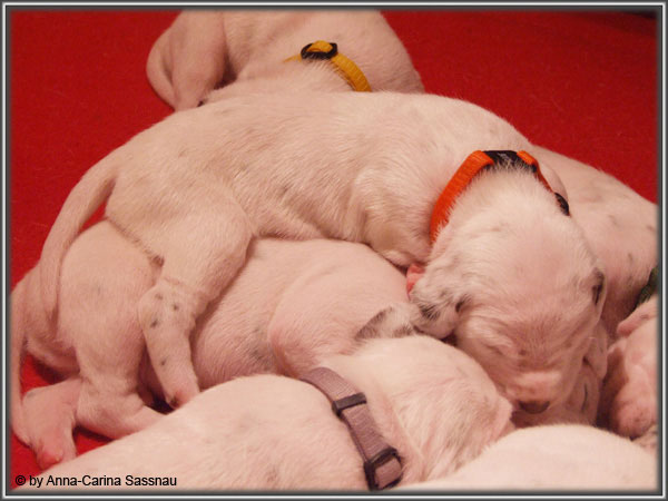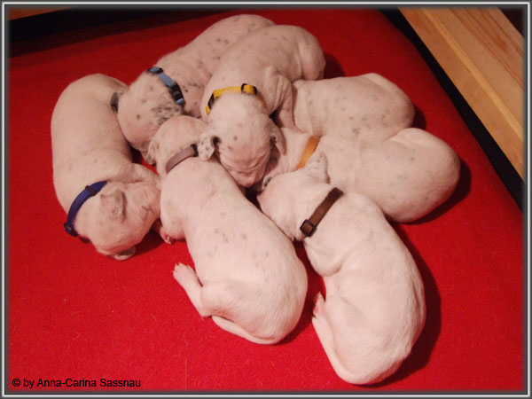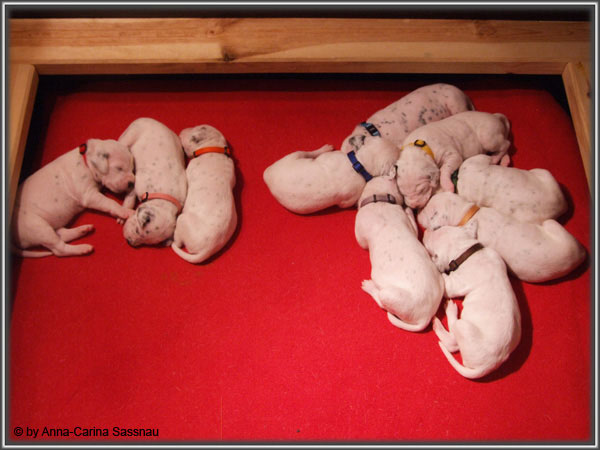 Nun ist auch schon fast die 2. Woche unserer Welpen vorbei. Sie haben sich in dieser Zeit super entwickelt. Die ersten Augen sind offen und die Lauf-Versuche werden auch schon immer besser. Die Punkte sind schon sehr gut erkennbar und auch die Lautstärke in der Wurfkiste ist etwas angestiegen. In dieser Woche haben unsere Welpen die neuen Halsbänder bekommen und auch die Namen werden wir heute bekannt geben. Bei der Zuordnung der Namen haben wir uns sehr viele Gedanken gemacht und sind mit der endgültigen Auswahl sehr zufrieden. Alaska erfüllt ihr Mutterpflichten sehr gut, schläft aber ab und zu schon mal auf ihrem "normalem" Schlafplatz. Nun könnt ihr euch erstmal die Bilder anschauen, während unsere Welpen noch ein wenig Mama-Milch trinken.