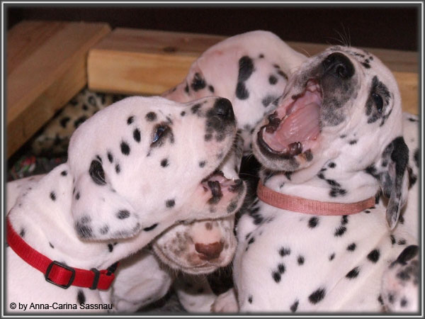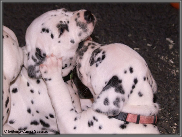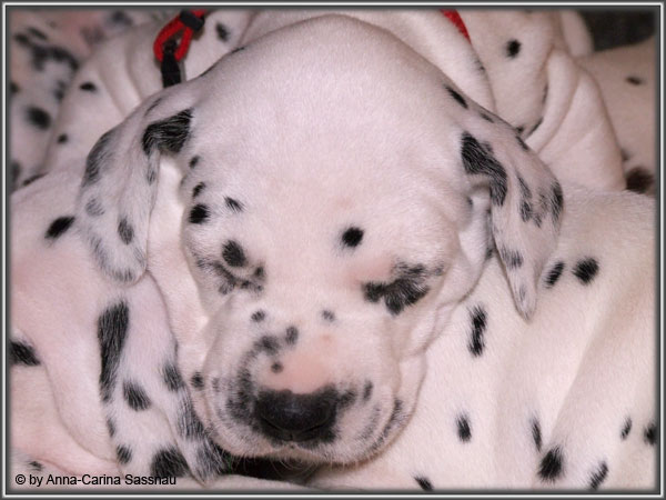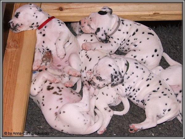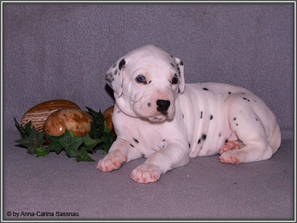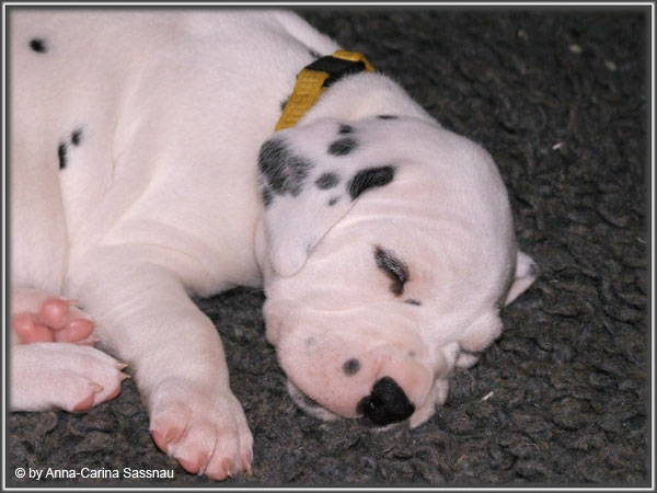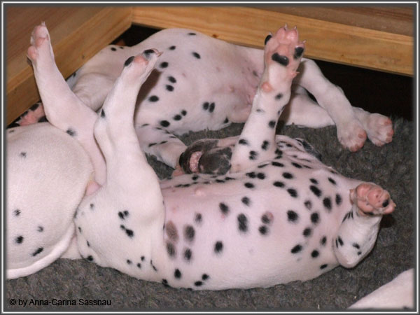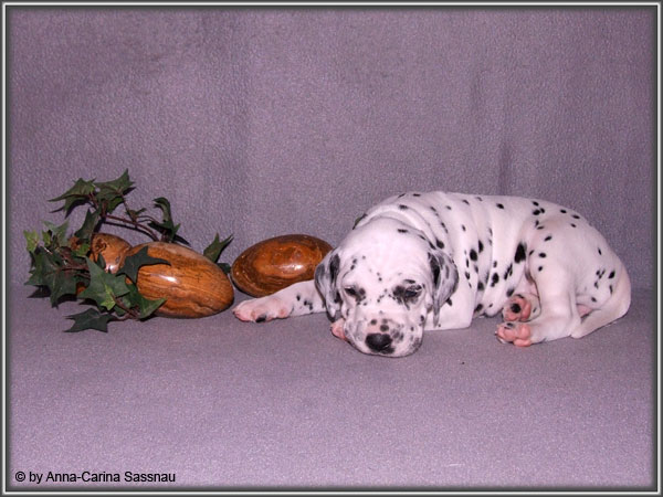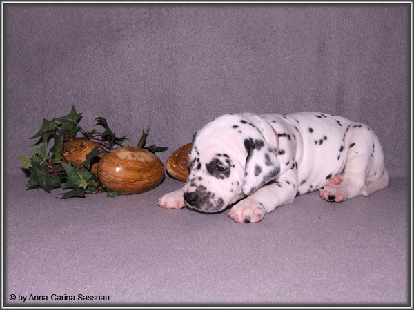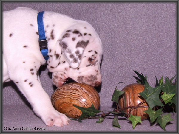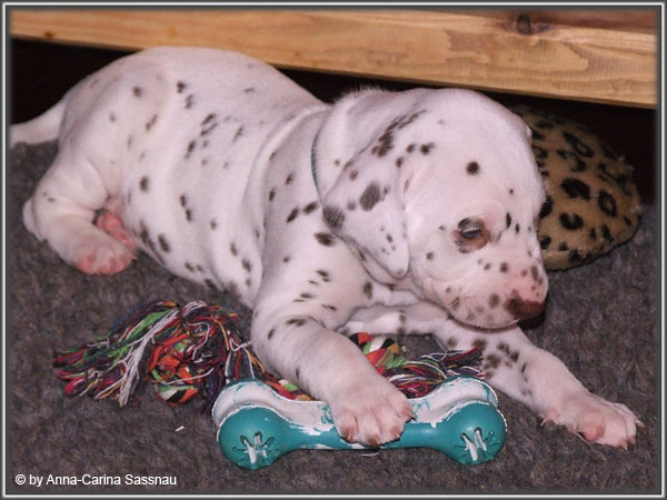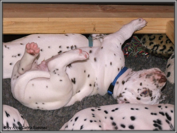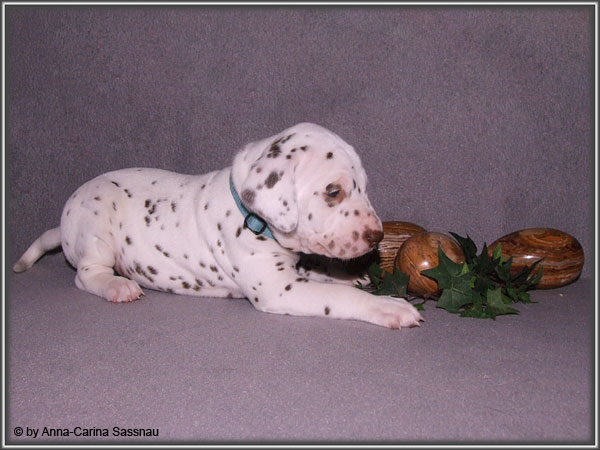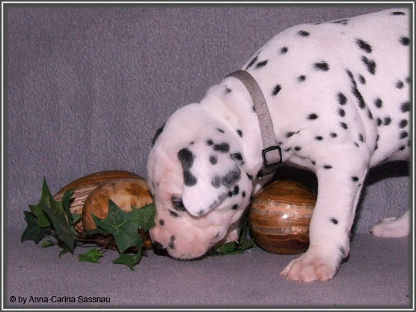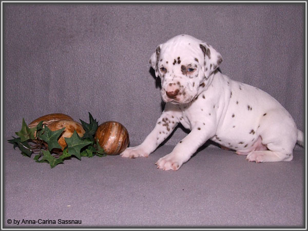 Ratz Fatz wie die Zeit verfliegt... Unsere B-chen sind nun schon 4 Wochen jung. Diese Woche haben sie noch komplett bei uns im Haus verbracht, da wir hier im Moment ziemlich schlechtes und kaltes Wetter haben - April eben. Aber Anfang der 5. Woche ziehen die Kleinen dann aber endlich um. Passend zu Ostern gibt es heute eine etwas andere Einzelvorstellung :-). Allerdings lief es nicht immer so "glatt" ;-). Die Fleckenzwerge sind schon sehr gut zu Fuß und das Wohnzimmer wird ganz genau unter die Lupe genommen. Das Welpenfutter wird auch sehr gerne von allen gefressen. Rücksicht kennen unsere Welpen nicht. Egal ob Ohren, Beine, Füße etc. an Allem wird gezerrt, gezogen und ordentlich geknabbert. Wenn sie noch keine Zähne hätten, wäre das ja auch nicht so schlimm ;-). Wir haben diese Woche auch einige Entdeckungen bei der Fleckung gemacht (siehe Bild). Die Welpen machen uns sehr viel Freude, auch wenn es oft sehr anstrengend ist und man gerne mal eine halbe Stunde länger schlafen würde. Aber nun genug an Text; ihr könnt euch jetzt erstmal die Fotos anschauen und wir wünschen euch Allen an dieser Stelle Frohe Ostern!!