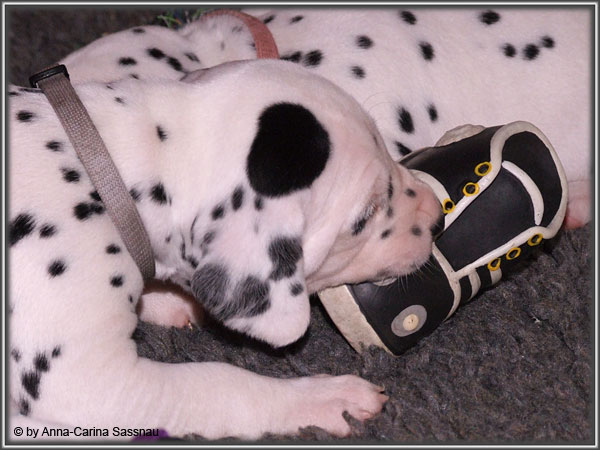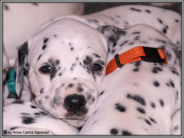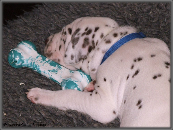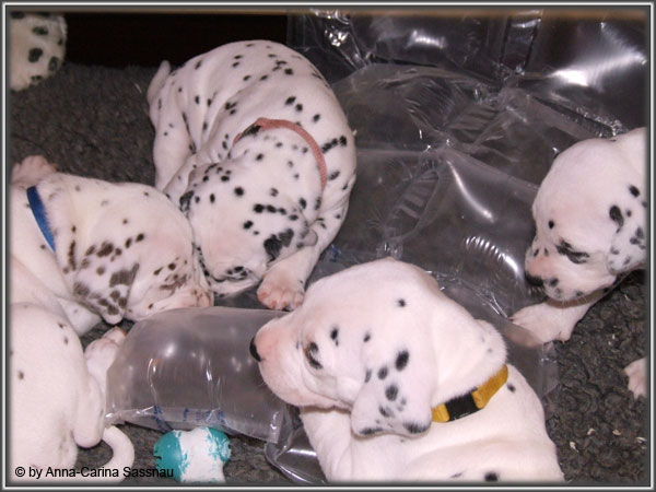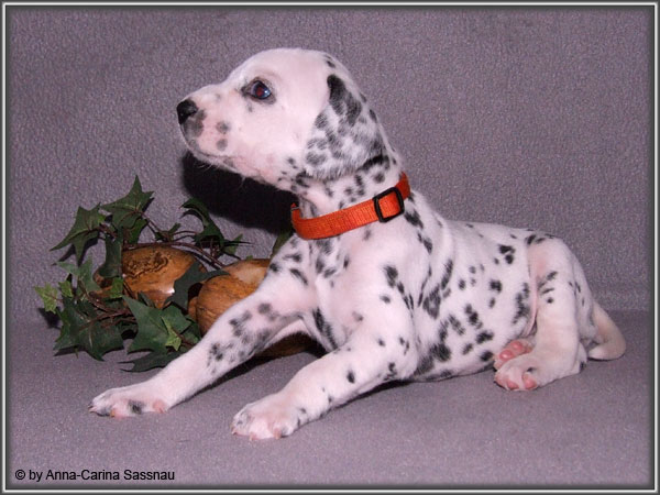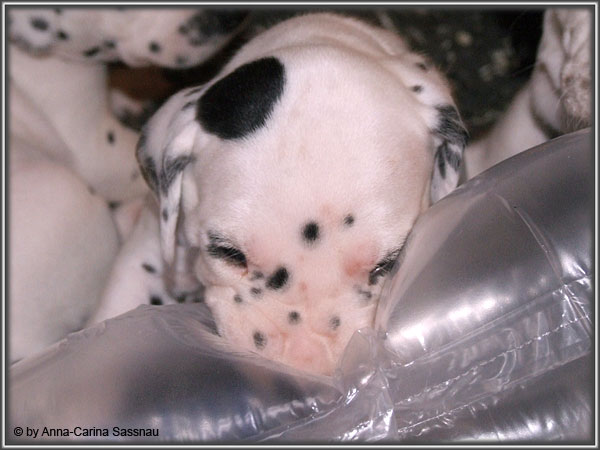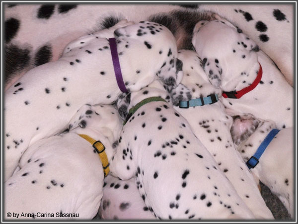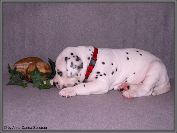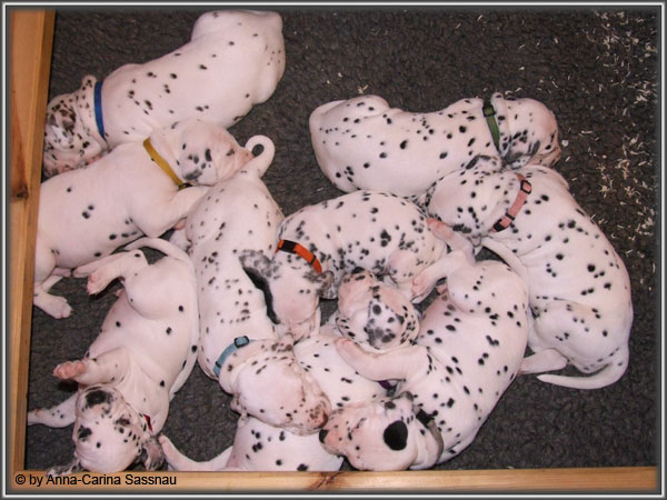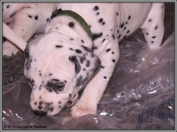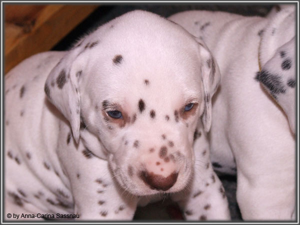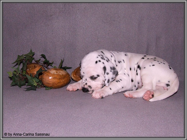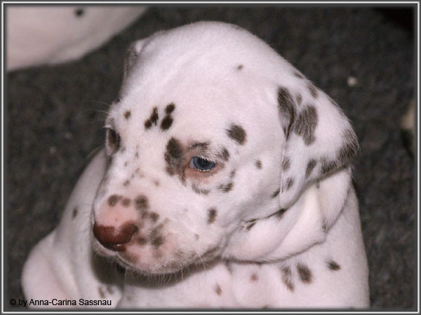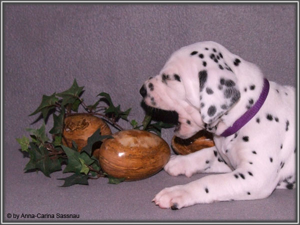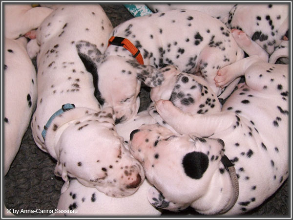 Ratz Fatz wie die Zeit verfliegt... Unsere B-chen sind nun schon 4 Wochen jung. Diese Woche haben sie noch komplett bei uns im Haus verbracht, da wir hier im Moment ziemlich schlechtes und kaltes Wetter haben - April eben. Aber Anfang der 5. Woche ziehen die Kleinen dann aber endlich um. Passend zu Ostern gibt es heute eine etwas andere Einzelvorstellung :-). Allerdings lief es nicht immer so "glatt" ;-). Die Fleckenzwerge sind schon sehr gut zu Fuß und das Wohnzimmer wird ganz genau unter die Lupe genommen. Das Welpenfutter wird auch sehr gerne von allen gefressen. Rücksicht kennen unsere Welpen nicht. Egal ob Ohren, Beine, Füße etc. an Allem wird gezerrt, gezogen und ordentlich geknabbert. Wenn sie noch keine Zähne hätten, wäre das ja auch nicht so schlimm ;-). Wir haben diese Woche auch einige Entdeckungen bei der Fleckung gemacht (siehe Bild). Die Welpen machen uns sehr viel Freude, auch wenn es oft sehr anstrengend ist und man gerne mal eine halbe Stunde länger schlafen würde. Aber nun genug an Text; ihr könnt euch jetzt erstmal die Fotos anschauen und wir wünschen euch Allen an dieser Stelle Frohe Ostern!!