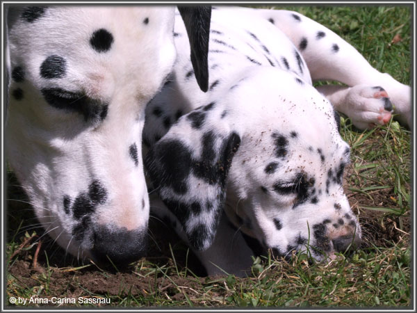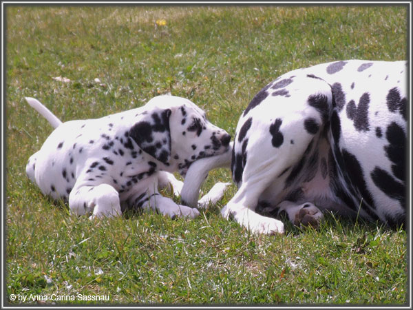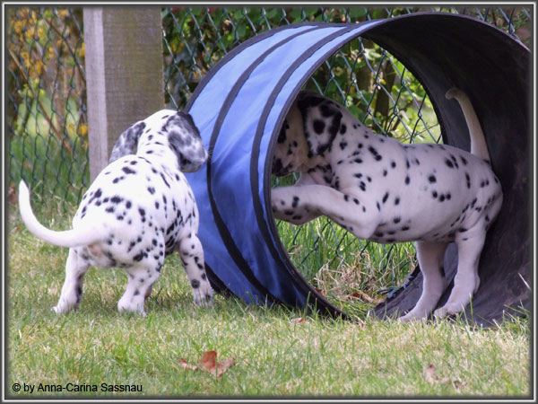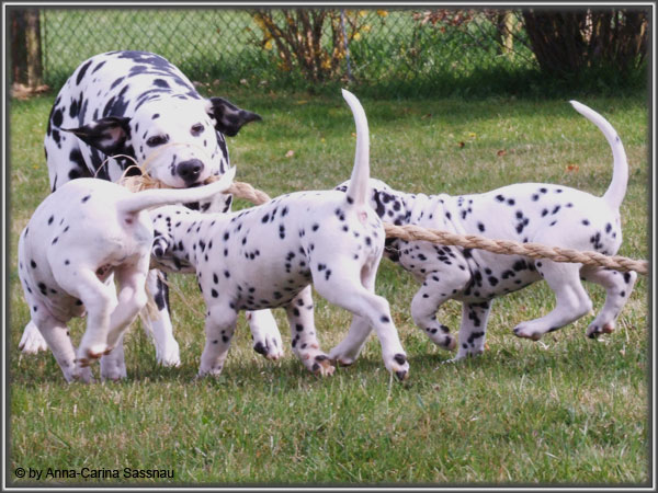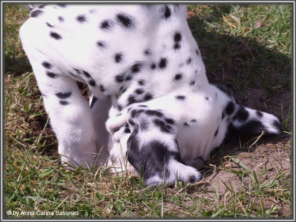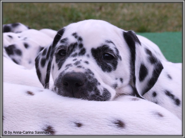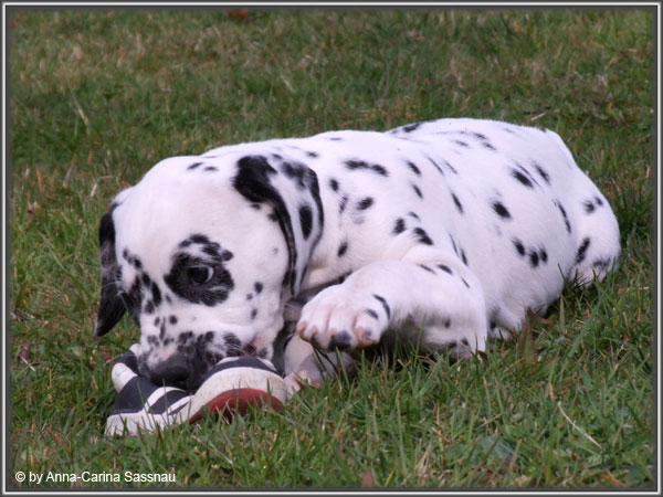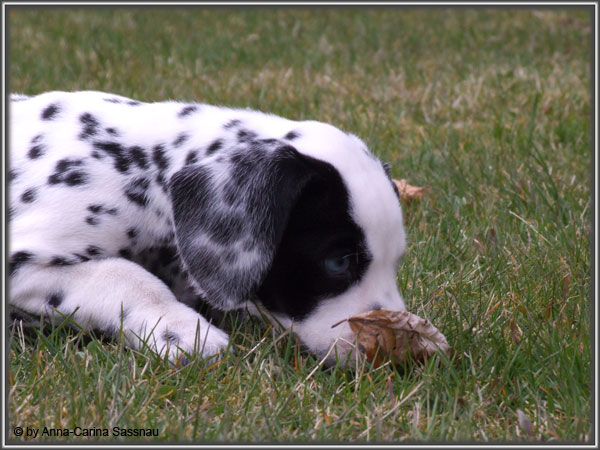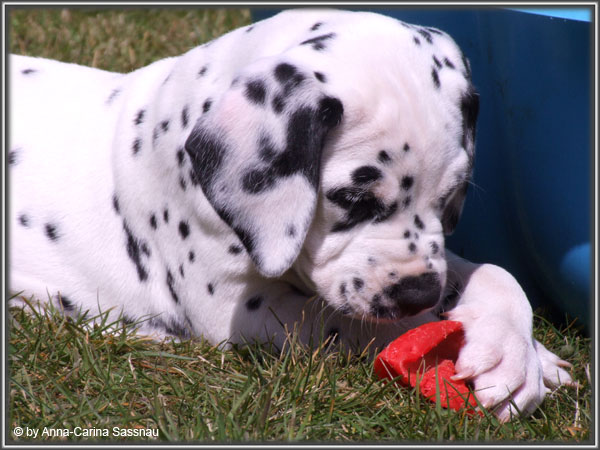 Auch die 7. Woche ist wieder wie im Fluge vergangen. Das Wetter ließ sehr zu Wünschen übrig und wir haben für die Fotos die trockenen Momente genutzt. Aber nächste Woche soll es ja hoffentlich besser werden. Unsere Welpen haben mittlerweile schon ziemlich gute Gewichte und sind topfit. Diese Woche gab es die 3. Wurmkur und nächste Woche steht dann die AEP (Hörtest), die erste Impfung und die Wurfabnahme auf dem Programm. Wir werden die nächste Woche noch einmal richtig genießen bevor uns auch schon die ersten Welpen wieder verlassen.