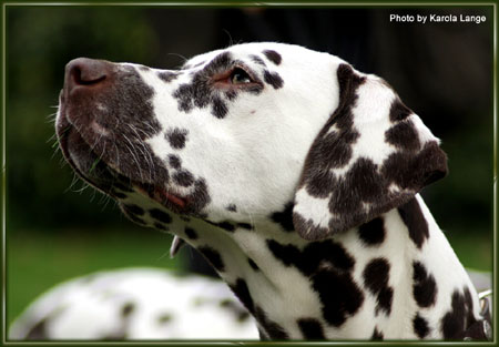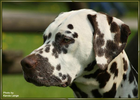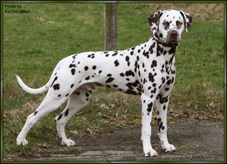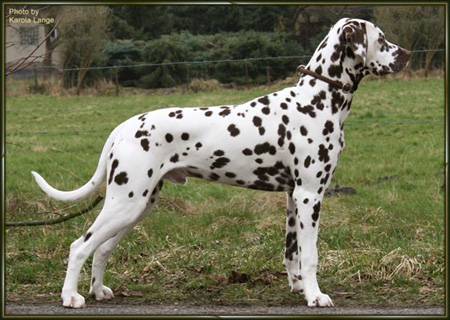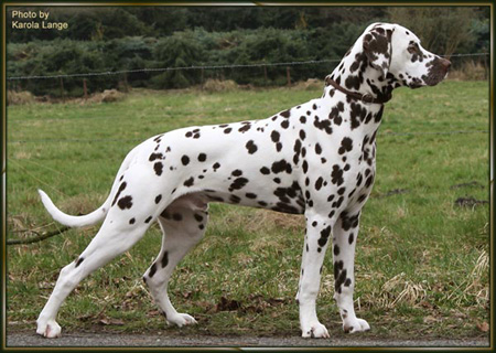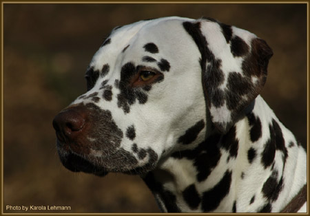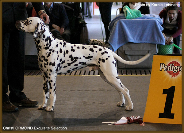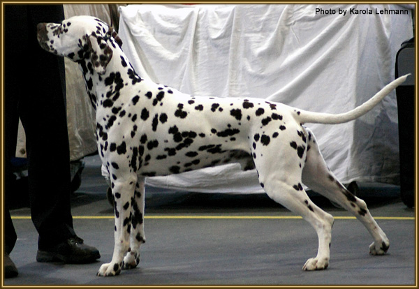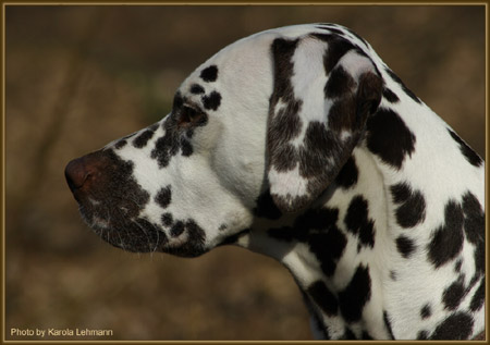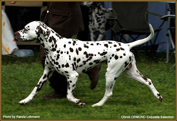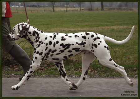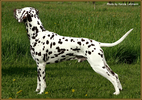 "Silas" besticht durch seine herausragend harmonischen Gebäudelinien, die im Stand wie auch in der Bewegung Geschmeidigkeit, kraftvolle Eleganz und einen athletisch bemuskelten Körper miteinander vereinen mit ausgesprochen viel rüdenhafter Ausstrahlung, Charisma und Adel. Er ist ein völlig in der Balance und 100 % im richtigen Rechteckformat (9:10) stehender, sehr knochenstarker, vorzüglich proportionierter und kräftig bemuskelter Rüde von hervorragender Substanz, mit vorzüglich saftigem Pigment. Vorzüglich typvolles Kopfmodell mit voll durchpigmentiertem Augen- wie auch Nasensaum, bernsteinfarbiges Auge, komplettes, kräftiges Scherengebiss, korrekt angesetzte und getragene gefleckte Behänge, trockener, sehr edel aufgesetzter, langer Hals, der schwungvoll in den stark ausgeprägten Widerrist übergeht. Er verfügt über eine ausgesprochen exzellente Brusttiefe mit vorzüglicher Bemuskelung der Vorbrust und Schulter. Schulter und Oberarm befinden sich in einem ausgezeichneten Winkel. Sein Rücken ist gerade und fest mit ausgesprochen korrekt gelagerter Kruppe, äußerst harmonische, einwandfreie Ober- u. Unterlinie, korrekte Rutenhaltung im Stand, wie auch in der Bewegung, exzellente Winkelung der Vor- und Hinterhand, vorzüglich und kräftig aufgeripptes Gebäude, vorzüglich verteilte Fleckung in sehr gutem Abstand stehend und von sehr guter Größe, kräftige, runde, vorzüglich aufgeknöchelte Katzenpfoten, ausgesprochen kraftvolles, raumgreifendes, gleichmäßig paralleles Gangwerk in der richtigen Trittfolge, geht mit Temperament und kontrolliertem, kraftvollem Schub aus der Hinterhand.
