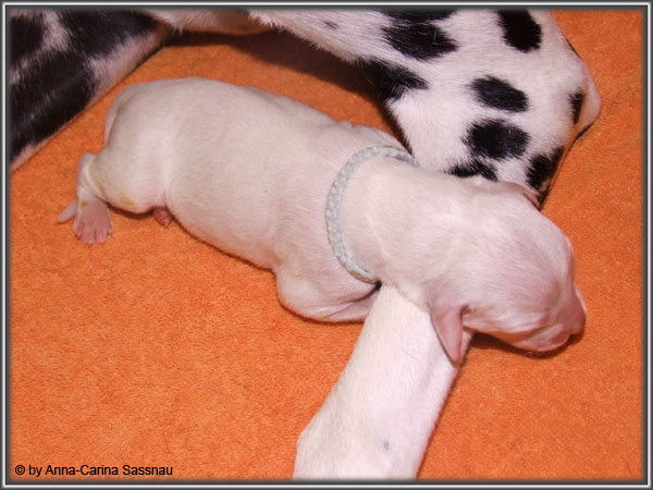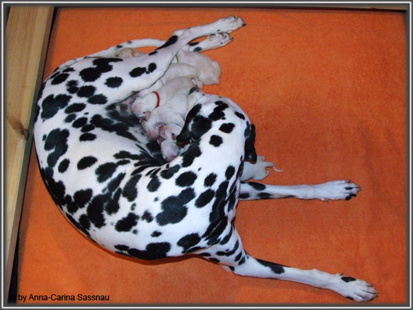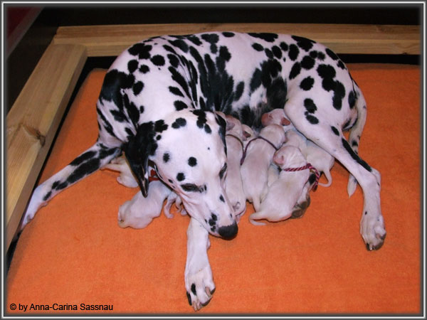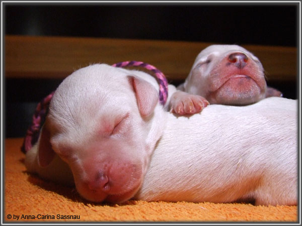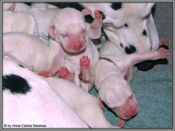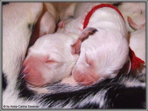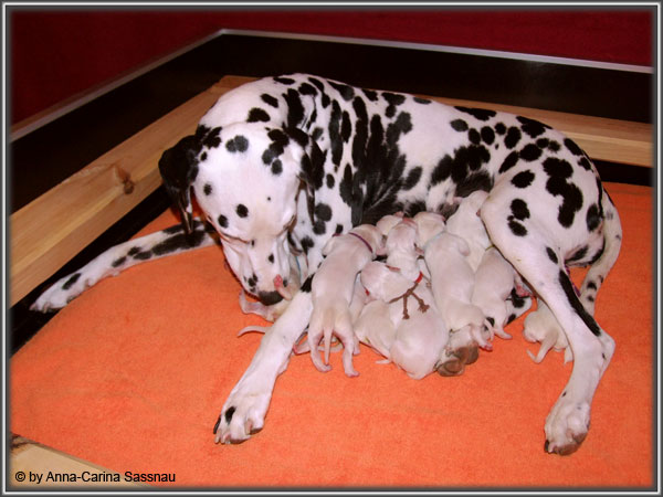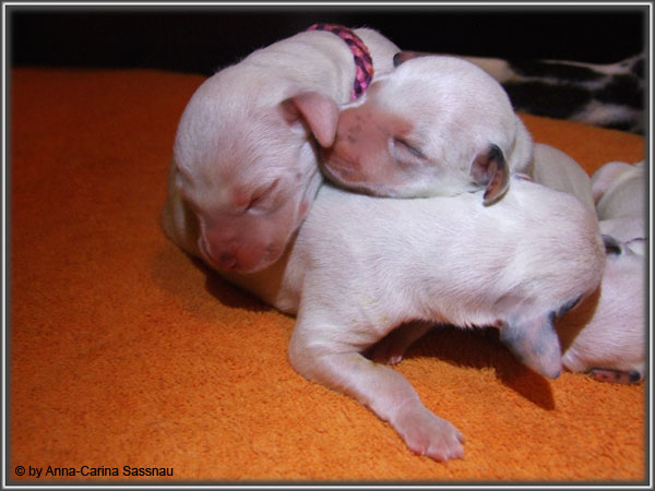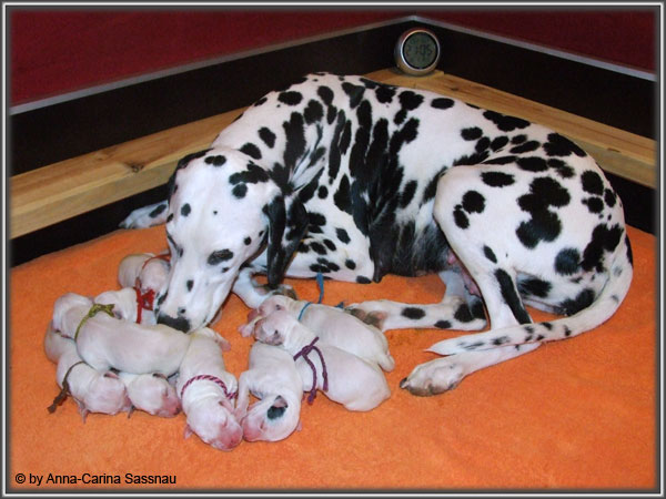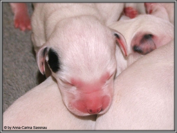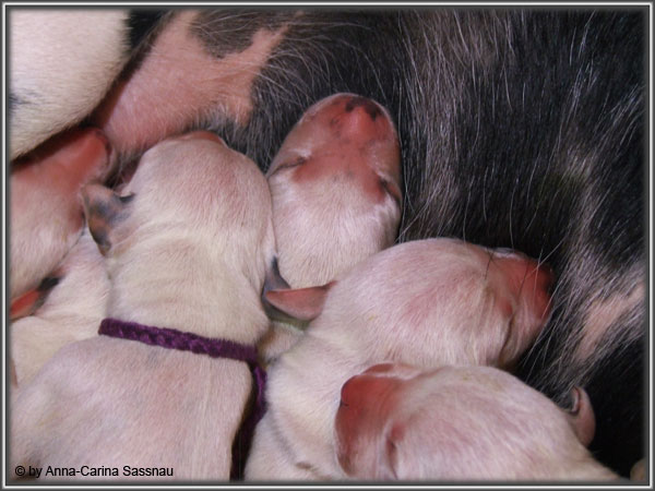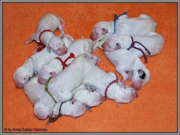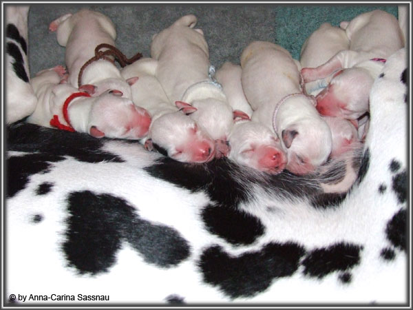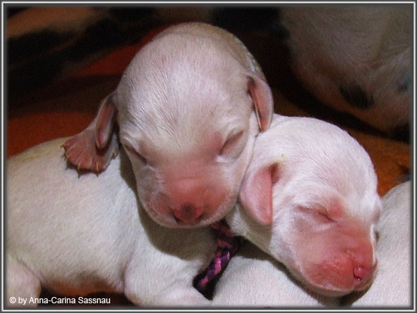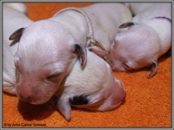 Unsere C-chen sind da!! Etwas früher als erwartet kam unser C-Wurf schon am 30.04.2014 zur Welt. Völlig problemlos und wie selbstverständlich brachte "Assiduitas Jingle Belle" (genannt Hollywood) ihre Welpen zur Welt. Um 6 Uhr morgens erblickte der erste Welpe "Mr. Black" (mit Kopf-Platte) das Licht der Welt und in nur knapp 5 Stunden folgten seine 9 weiteren Geschwister. Nun haben wir 7 Rüden (4 w-s & 3 w-b) und 3 Hündinnen (2 w-s & 1 w-b). Allen 10 Welpen geht's prima und auch Mama "Hollywood" ist topfit!! Wir danken "Hollywood" sehr für alle gesunden & quietschfidelen Welpen und ihren 1A Umgang mit den Kleinen. Besser hätte eine Geburt gar nicht laufen können. "Hollywood" kümmert sich super um ihren Nachwuchs und geht mit der gesamten Situation sehr entspannt um. Sogar "Alaska" darf ab und zu schonmal zuschauen und beobachten, obwohl sie natürlich viel lieber mithelfen würde ;-) Ihr könnt euch jetzt die ersten Bilder anschauen und nächste Woche gibt es dann wieder neue Info's, Bilder und natürlich die Einzelvorstellungen von den kleinen Smiling Spots :-)