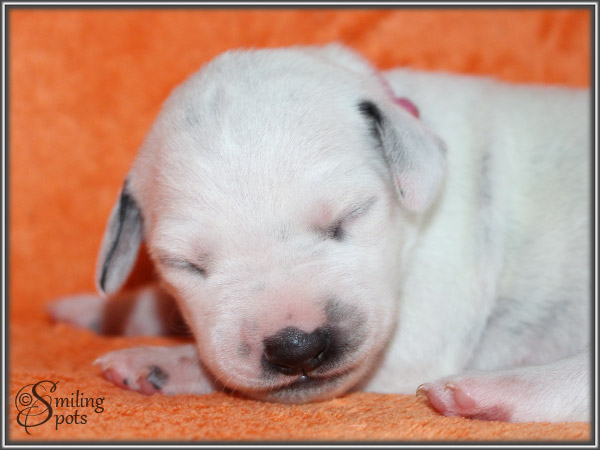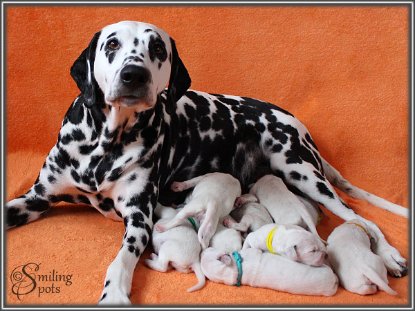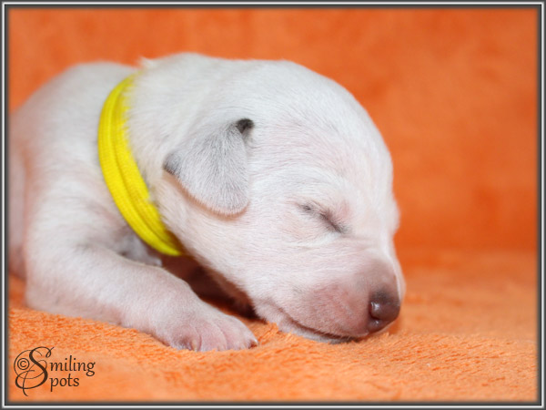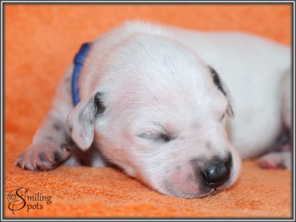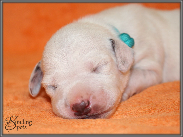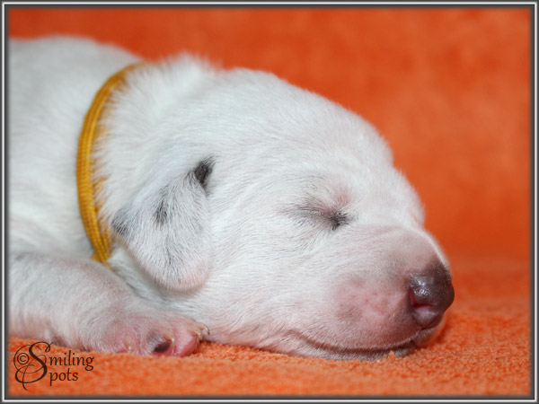 Hey Leute! Ich bin's "Everlasting Fighter Heart of the Smiling Spots", hier werde ich aber nur "Schwarzohr" genannt. Meine Geschwister und ich sind schon 1 Woche alt. Dank Mama's 24/7 geöffneter Milchbar, haben wir schon richtig gut zugenommen. Momentan ist unser Alltag aber noch ziemlich eintönig. Wenn wir nicht gerade Milch trinken, dann träumen wir ganz schön viel - was verrate ich euch aber nicht :-) Mama ist ab und zu immer mal wieder unterwegs... Wenn uns das zu lange dauert, dann machen wir uns lautstark bemerkbar. Bellen können wir nämlich schon ganz gut. Aber wir sind ja auch schon "groß", da können wir mal einen Augenblick alleine bleiben. Mit unserer Geburt hat ja auch ganz plötzlich der Sommer eingesetzt. Deshalb versucht Mama uns irgendwie ein kühles Plätzchen "zu bauen", bisher hat Frauchen sie aber davon abgehalten... Papa hat Mama übrigens die schönen Bändchen zu unserer Geburt geschenkt, damit ihr uns alle auseinander halten könnt. Mama kümmert sich super um uns - Tag und Nacht!! Mama ist und bleibt eben einfach die BESTE! Soo, nun muss ich aber auch wieder los; Mama-Milch trinken - will ja schließlich mal in Papa's Pfotenstapfen treten können...