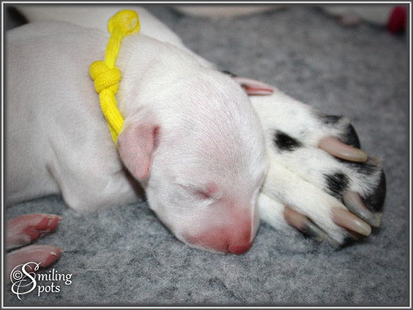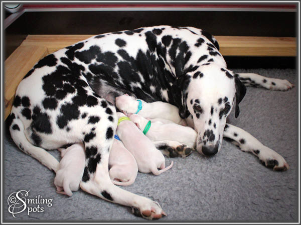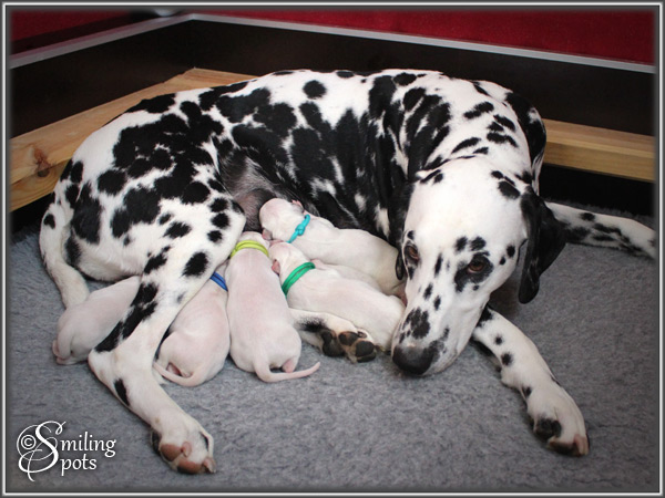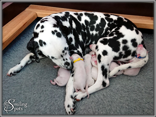 Lieber Nox, unsere Babys sind da! Nachdem wir eine unruhige und fast schlaflose Nacht hatten (ich habe Frauchen mit wach gehalten - alleine wach sein wollte ich auch nicht), habe ich am Dienstag Morgen innerhalb von 4,5 Stunden unsere 7 Würmchen (5 Rüden | 2 Hündinnen) zur Welt gebracht. Um eine von unseren kleinen Prinzessinen musste sich allerdings zuerst Frauchen kümmern. Sie hatte kein Lebenszeichen und zu viel Fruchtwasser geschluckt. Also blieb mir vorerst nur die Nachgeburt von ihr. Nach 10 Minuten bekam ich sie endlich wieder: Das kleine Kämpferherz schlägt! Nun sind unsere 7 Würmchen fleißig am Trinken. Wir hoffen, dass alle weiterhin gut zunehmen und gesund bleiben. Frauchen ist sehr stolz auf mich, dass ich die Geburt so gut gemeistert habe. Und jetzt kümmer ich mich, wie auch schon beim letzten Mal, hervorragend um unsere Kleinen, damit sie groß und stark werden.