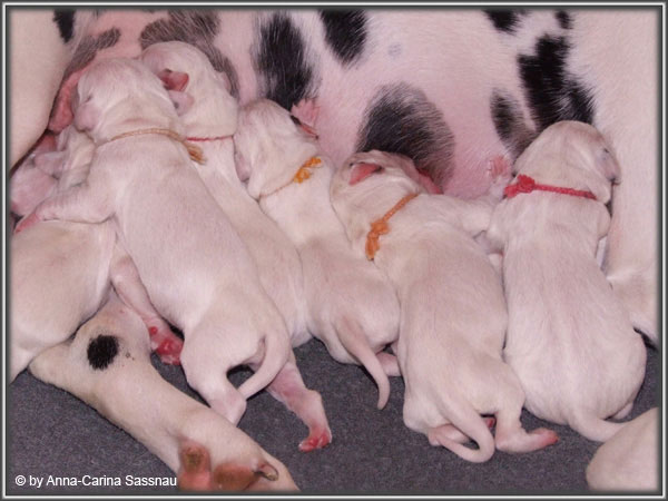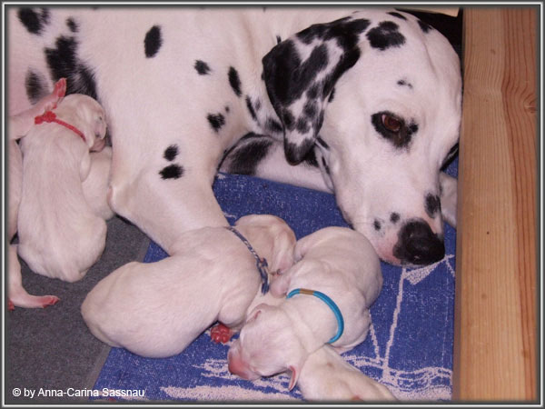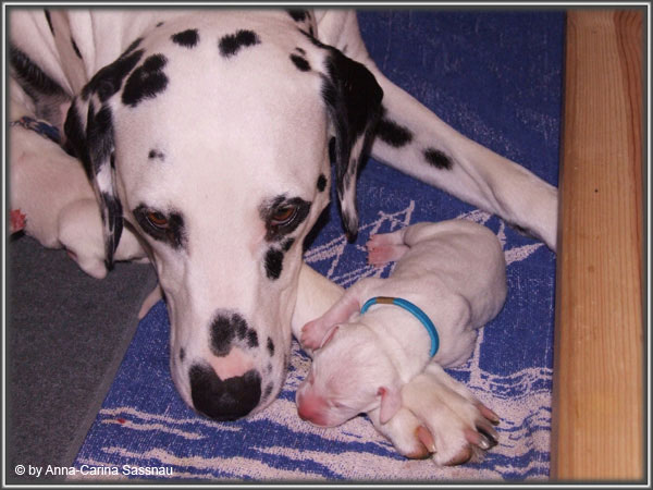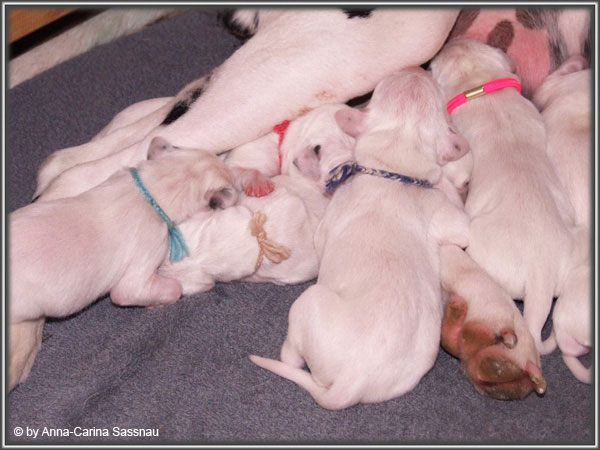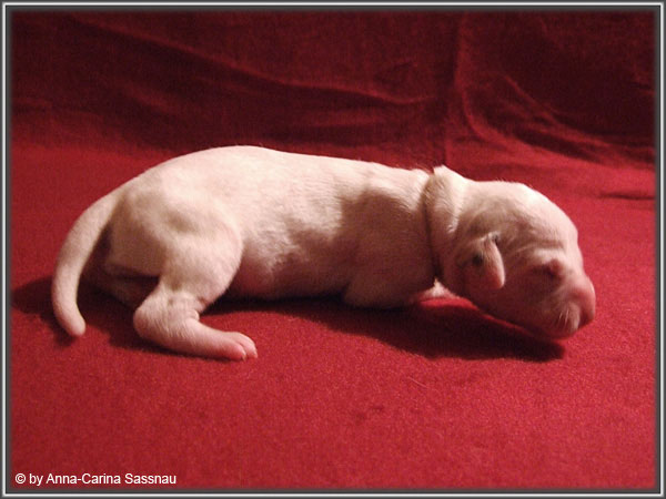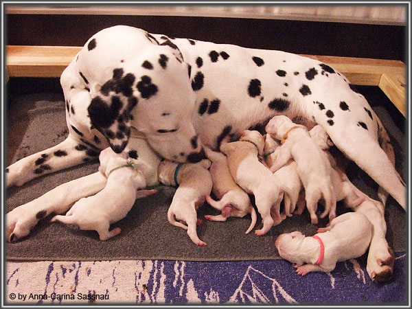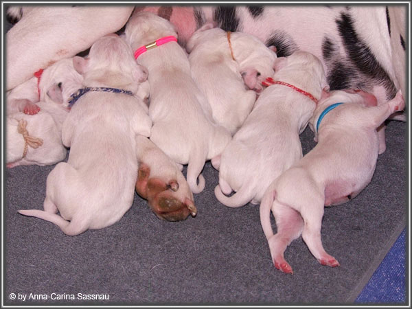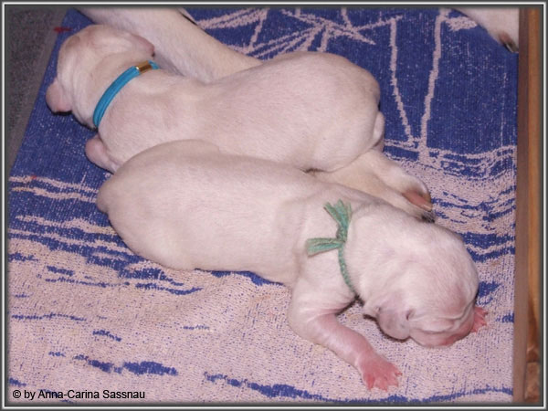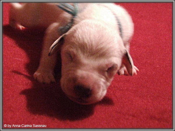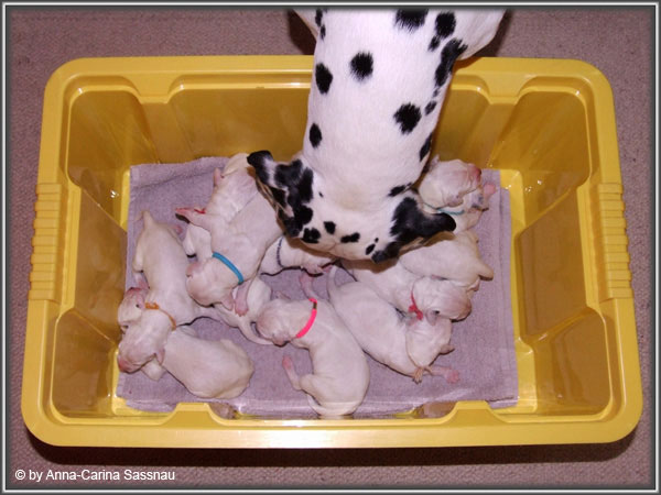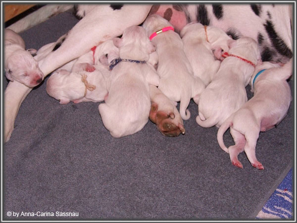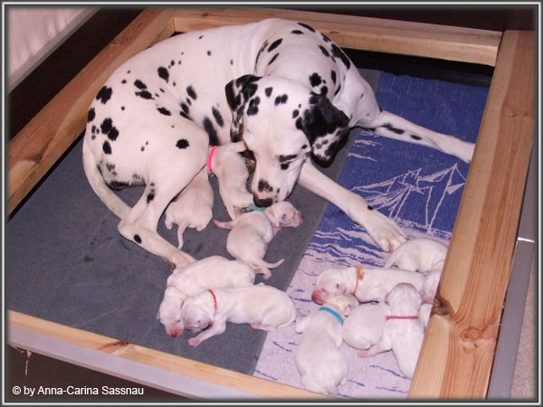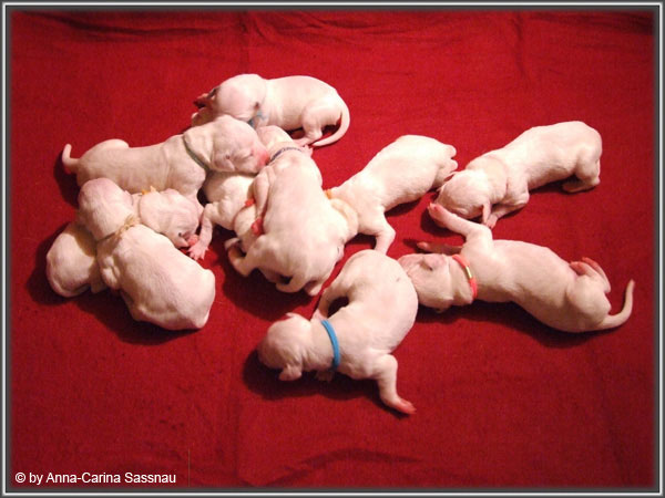 Am 17.05.2010 war es endlich soweit: Unser A-Wurf sollte geboren werden. Schon am 16.05. gab es einige Anzeichen auf die bevorstehende Geburt und so haben wir in dieser Nacht auf unsere Welpen gewartet. Doch es passierte nichts... Am nächsten Tag wollte Alaska gar nicht mehr ihre Wurfkiste verlassen und somit war sie von uns unter ständiger Beobachtung. Um 18:45 Uhr schenkte sie in unserer Zuchtstätte dem ersten Welpen das Leben. Nach einer Pause ging es dann mit den nächsten weiter. Um 01:32 Uhr wurde der 10. und letzte Welpe geboren. Wir sind sehr stolz auf die süßen kleinen Baby's von Alaska und Antaro. Es freut uns sehr, dass es der Hündin und allen 10 Welpen sehr gut geht. Alaska's Bauch ähnelt langsam wieder dem von einem Hund ;-) ... Nun zeigen wir euch erstmal ein paar Bilder von unseren Welpen :-)